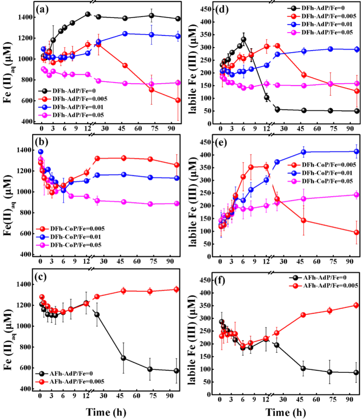 图4在2mMFe(II)诱导下,吸附态(Ad)和共沉淀态(Co)含磷水铁矿转化过程中,溶液态Fe(II)aq(a、b、c)及活性Fe(III)(d、e、f)的随时间变化浓度(AFh与DFh分别代表聚集型与分散型水铁矿)。注:首次取样时间为0.5h