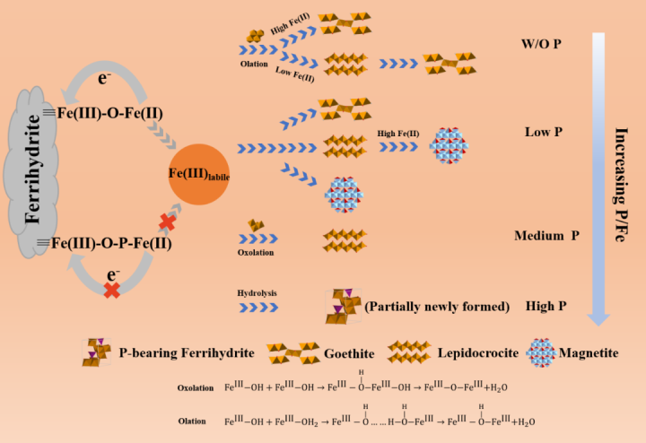 Fe(II)先吸附于水铁矿表面,发生IET生成活性Fe(III),进而成核-生长为针铁矿、纤铁矿或磁铁矿。随着P/Fe升高,路径从针铁矿为主→“针铁矿+磁铁矿+纤铁矿”混合物→纤铁矿→基本保持水铁矿。P通过增强Fe(II)吸附、抑制活性Fe(III)生成、延缓晶化的三重作用,实现对整个矿物演化链条的精细调控。