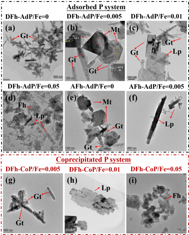 无P条件下,DFh主要生成孪晶针铁矿,AFh则生成棒状针铁矿和六边形磁铁矿。低P吸附时,DFh中出现针状针铁矿与菱/六边形磁铁矿并存,AFh则以片状纤铁矿为主。中等P负载下(吸附/共沉淀),产物逐步由针铁矿转向片状纤铁矿占优势。高P(P/Fe=0.05)时,无论DFh还是AFh,均以低晶化水铁矿团聚体为主,晶体生长明显受阻。整体上,P的存在不仅减缓晶体生长速率,还显著改变铁矿物的形貌类型与粒径特征。