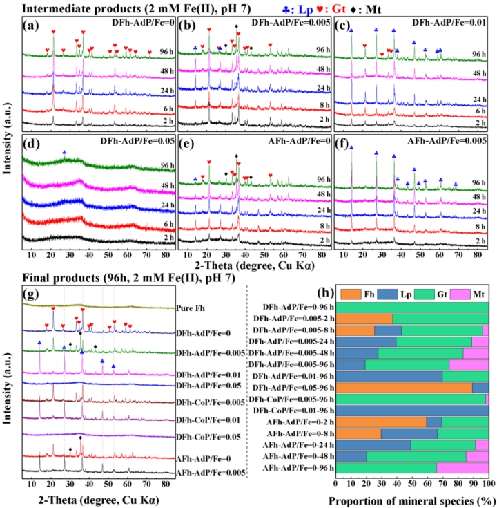 图2在2mMFe(II)催化的含磷水铁矿转化过程中,不同中间产物的XRD图谱:分散型水铁矿(DFh)中吸附态(Ad)P/Fe比为0(a)、0.005(b)、0.01(c)和0.05(d);聚集型水铁矿(AFh)中吸附态P/Fe比为0(e)和0.005(f);最终产物的对比(g);以及基于FeK边XAS的LCF拟合所得Fe相相对含量(h)