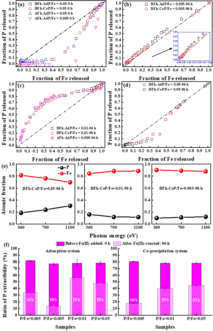 图5含磷水铁矿(P/Fe=0.05或0.005)在老化前(a)的Fe溶解比例与P溶解比例曲线,以及在pH7条件下经2mMFe(II)诱导转化后、分别以针铁矿和磁铁矿(b)、纤铁矿(c)及水铁矿(d)为主导最终产物的溶解曲线。不同光子能量下同步辐射光电子能谱(SRPES)获得的颗粒不同深度处P与Fe原子分数变化(e),以及含磷水铁矿在老化前后(96h)经0.1MNaOH提取的P的可提取性变化(f)。注:a-d图中的点划线表示完全同步溶解