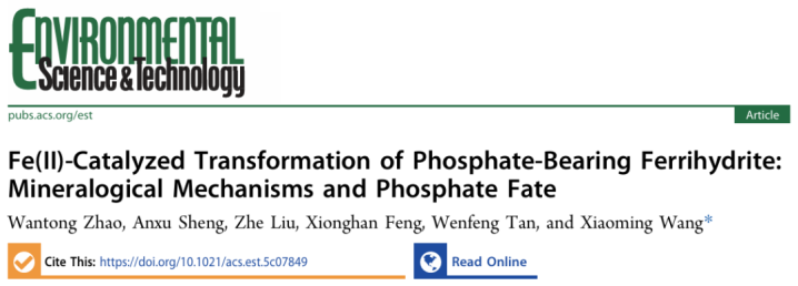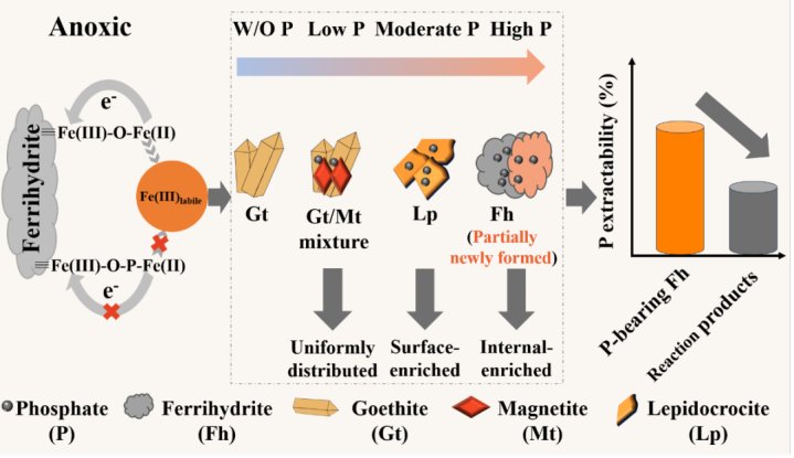 磷(P)是维持农业生产力和生态系统功能的关键营养元素,但在土壤中极易被水铁矿等铁氧化物强烈固定,从而显著降低其迁移性与生物有效性。水铁矿因其高比表面积和大量活性位点成为主导P固持的矿物,但其结构热力学上不稳定,在缺氧条件下可经由微生物或表面吸附Fe(II)的作用发生快速转化。水铁矿一旦发生转化,其结构、孔隙和晶体形态即发生显著变化,直接导致原本固定于其中或表面的P重新迁移、包埋或释放。因此,P在水铁矿转化过程中的归趋成为影响土壤P循环和生态风险的关键科学问题。现有研究指出,高负载P可显著抑制水铁矿的晶化,并影响Fe(II)-介导的矿物转化路径,但这些研究主要集中在较高的P/Fe比范围。对于土壤中更常见的低P/Fe(